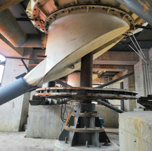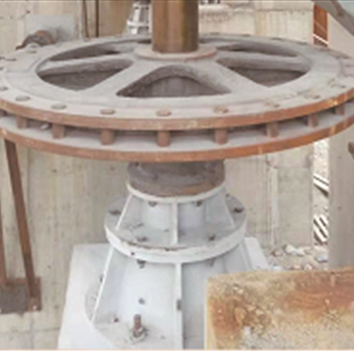 鎂砂出爐機由于鎂砂的特性,該出爐機傳動裝置設計為液壓間斷推力式傳動方式,即液壓站、液壓推桿前進后退,液壓推桿推動主軸上的傳動盤旋轉,從而帶動整個出爐機工作,該傳動、方式適用于物料阻力較大,流動性較差的窯體。