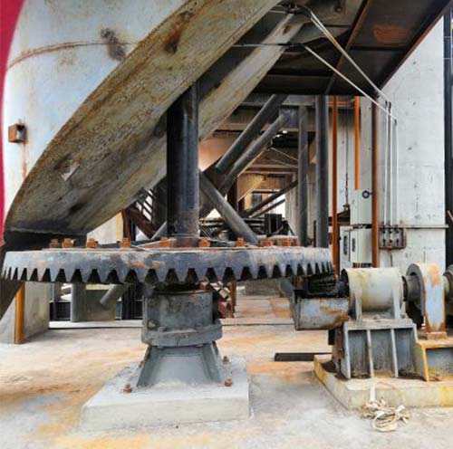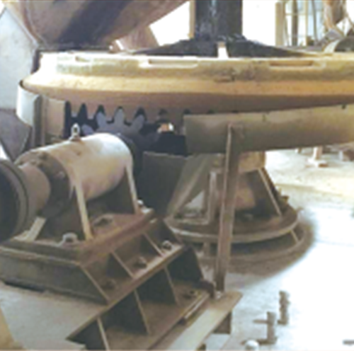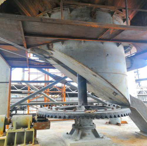 我公司生產的輕燒出爐機;主要有分料錐、分料盤、支撐盤、主軸、排料椎體、傳動裝置、底座等部分組成、分料錐、分料盤及主軸均采用特殊材質及工藝,保證了工作時的強度以及耐磨性,采用全機械化方式,節省人工出料時的成本,提高了工作效率,輕燒出爐機由于輕燒等物料特性,該出爐機傳動裝置設計為齒輪連續傳動方式,即電動機帶動主動齒輪旋轉,主動齒輪與主軸上的被動齒輪齒合。從而帶動整個出爐機工作,該方式適用于物料阻力較小,物料流動性較好的窯體。